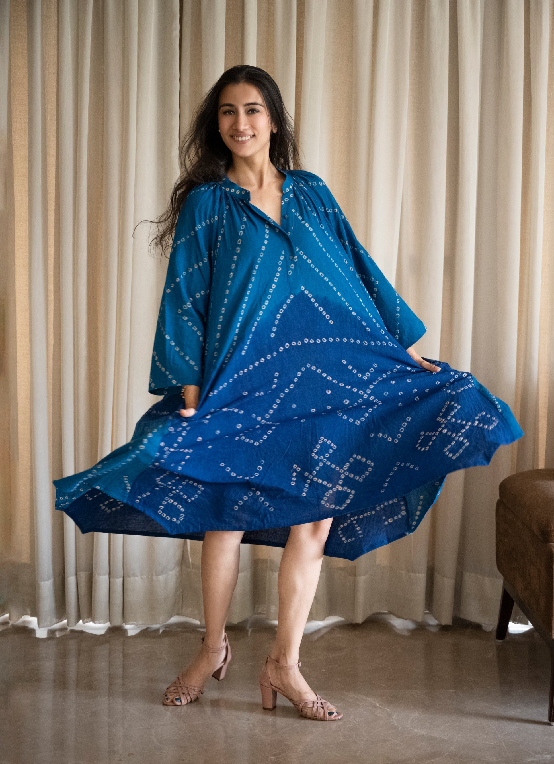 Kala cotton Bandhini dress in a electric blue variation, making it a classic summer piece. The bandhini or tie-dye on this dress was done in Kutch, Gujarat. Bandhini is a highly skilled and time-consuming art form, primarily practiced by women. This traditional art form involves plucking the cloth with fingernails into many bindings to form a design.